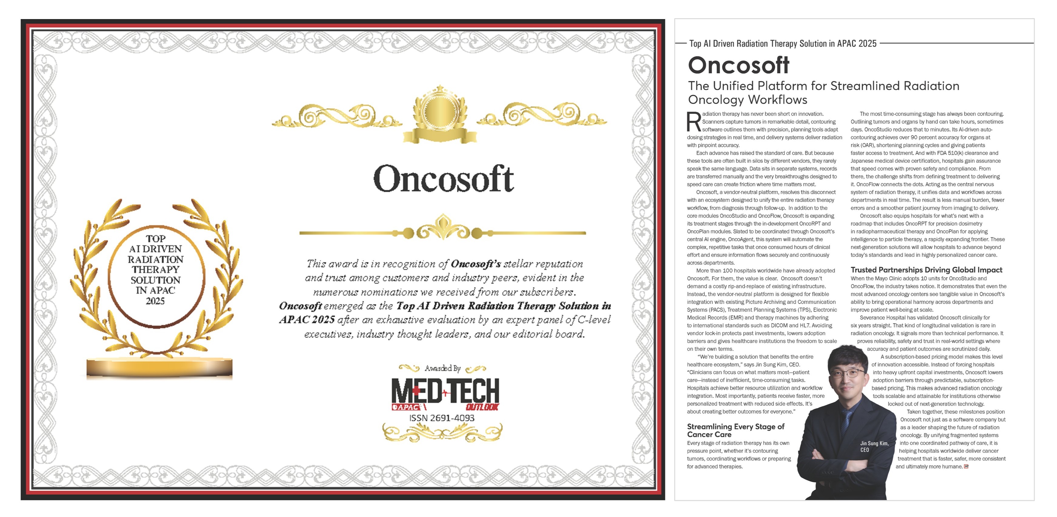 AI(인공지능) 방사선 치료 소프트웨어 전문기업 온코소프트(대표 김진성)가 최근 'MedTech Outlook(메드테크 아웃룩) APAC'이 발표한 '2025년 아시아태평양 최고 AI 방사선 치료 솔루션'에 선정됐다고 10일 밝혔다.